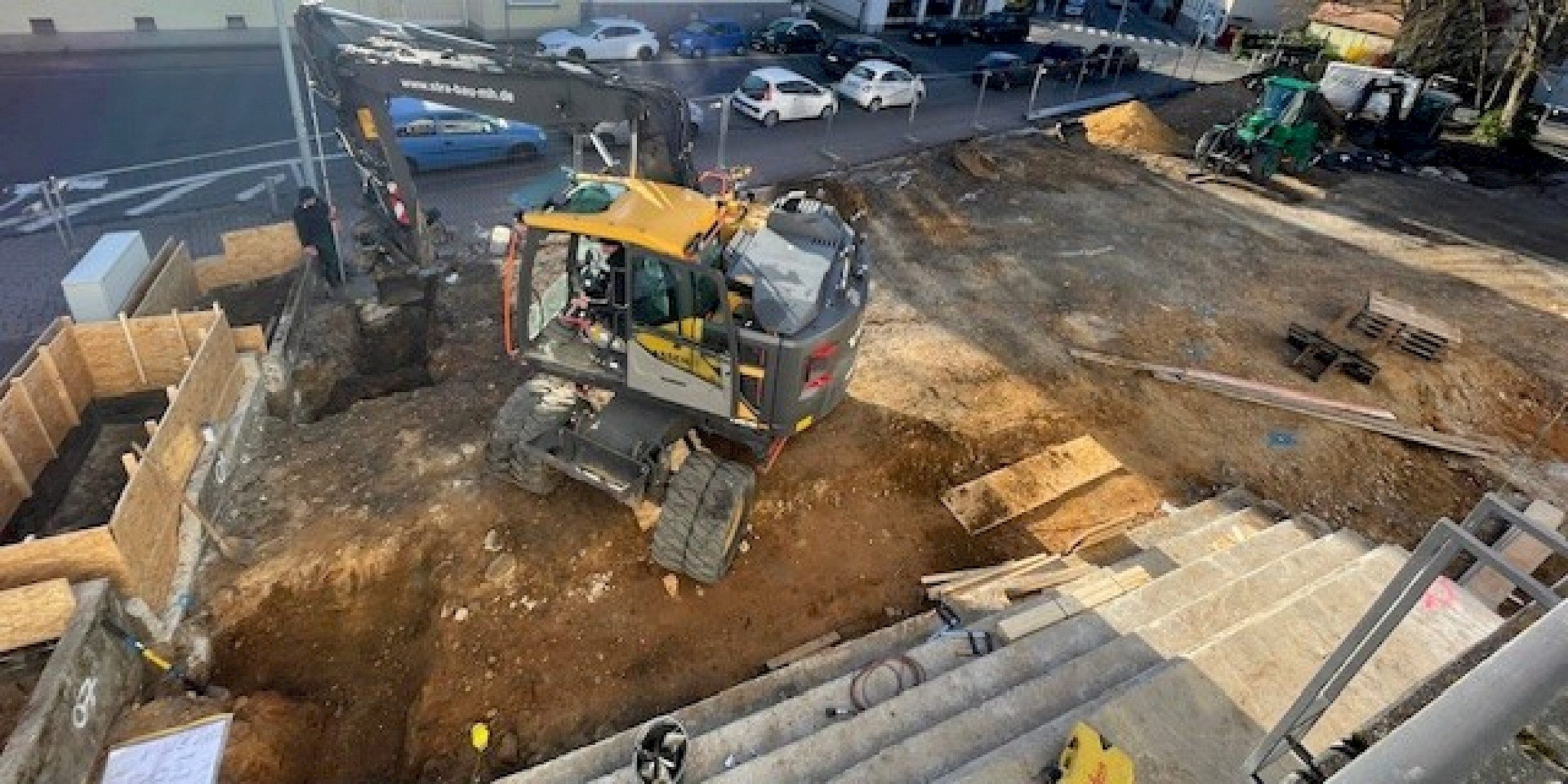 Die Sanierungsarbeiten an der Stadthalle gehen weiter: Es wurden mit den Baggerarbeiten begonnen und die alten Plattensteine entfernt. Der aktuelle Stand zeigt die Fortschritte auf der Baustelle.